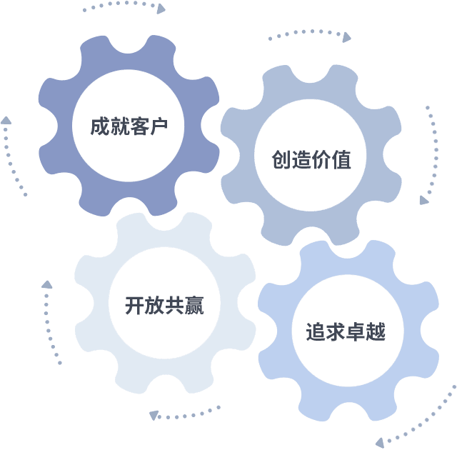 成就客户是一切决策的出发点,,,,创造价值是衡量所有工作的标准,,,追求卓越是我们做事做人的态度,,,,开放共赢是我们的格局也是最终的结果。。价值观的齿轮环环相扣,,推动着组织里的每个人不断向前。。。。