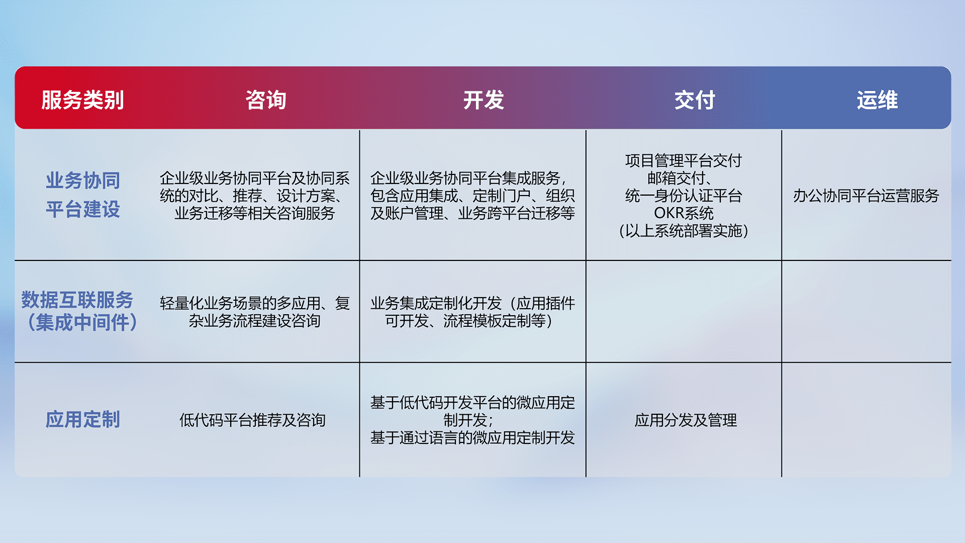 针对钉钉、、、企微、、、IDaas等平台级产品提供产品的规划、、方案、、、交付、、、定制化开发等服务,,,实现如统一协同办公、、、、智能客户服务、、、、混合会议管理、、、智能数据查询、、等业务场景,,,实现数字化转型。。